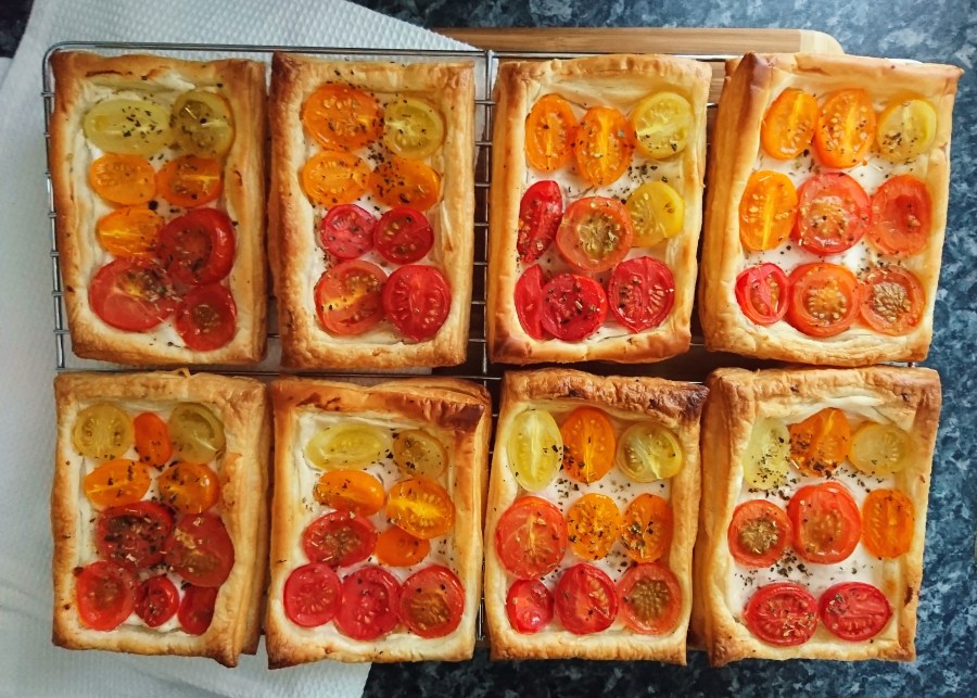 These savoury tarts consist of golden flaky puff pastry, dairy free soft cheese, colourful cherry tomatoes and herbs. Perfect hot or cold, they would make for a lovely summer dinner, served along with a fresh green salad and potato salad