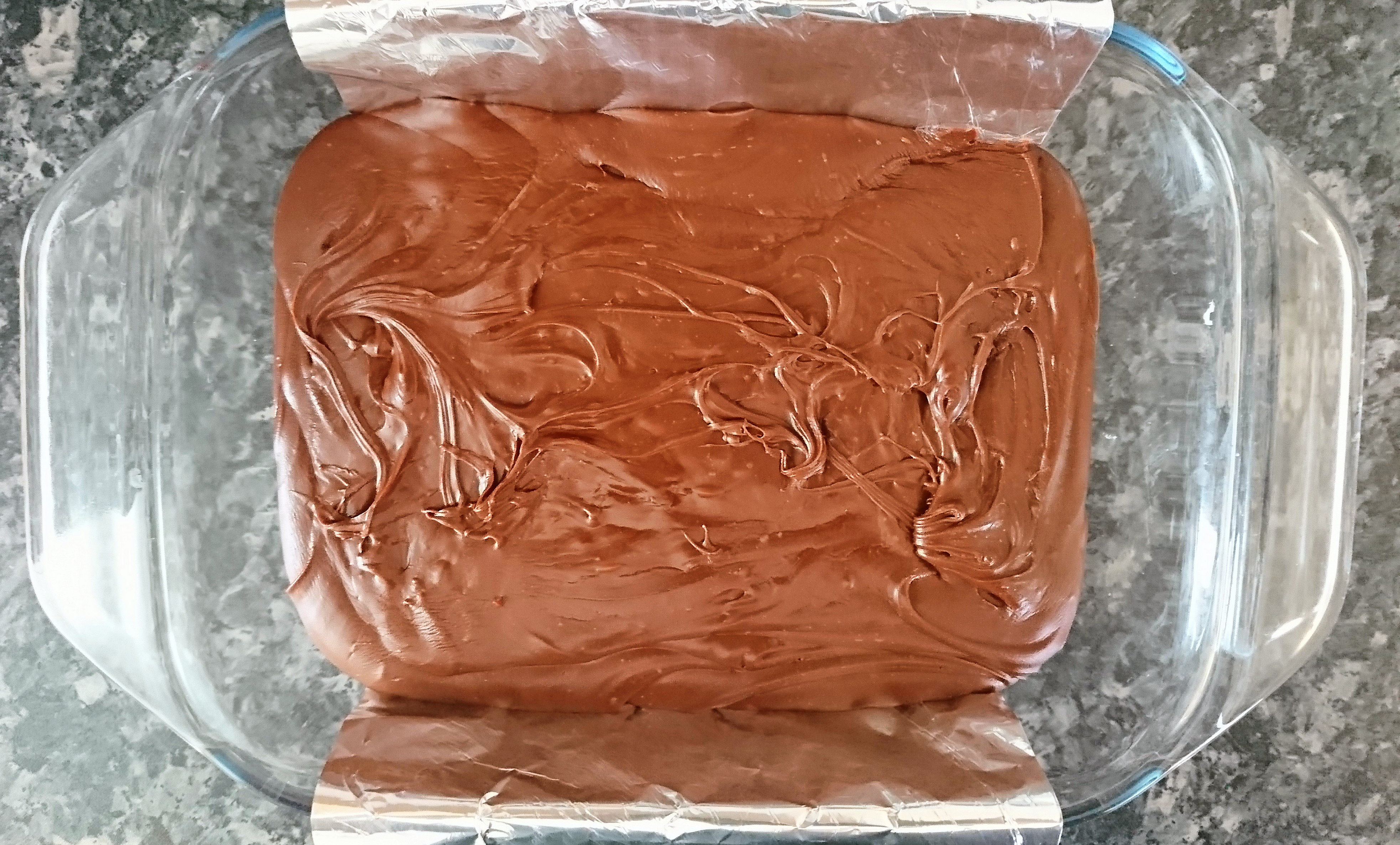 - Leave it to cool to room temperature for an hour, then pop it into the fridge for a good three hours (or overnight if you can). As you can see in this image I didn’t line the whole dish in foil. I would recommend lining the whole dish, as the fudge stuck to the parts without foil. I encouraged it out with a sharp knife, but it would have been easier to just line the whole of the dish
