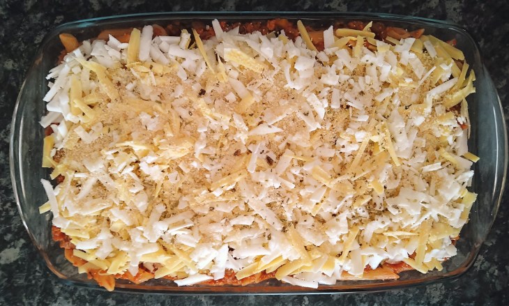 - Top the pasta and bolognese with the cheese. I used a 50/50 mix of Vitalite Dairy Free Cheese and Ilchester Melting Mature cheese which you can buy from Tesco, Sainsbury’s or online from various different websites. Top the cheese with the breadcrumbs and mixed herbs, then it’s ready for the oven