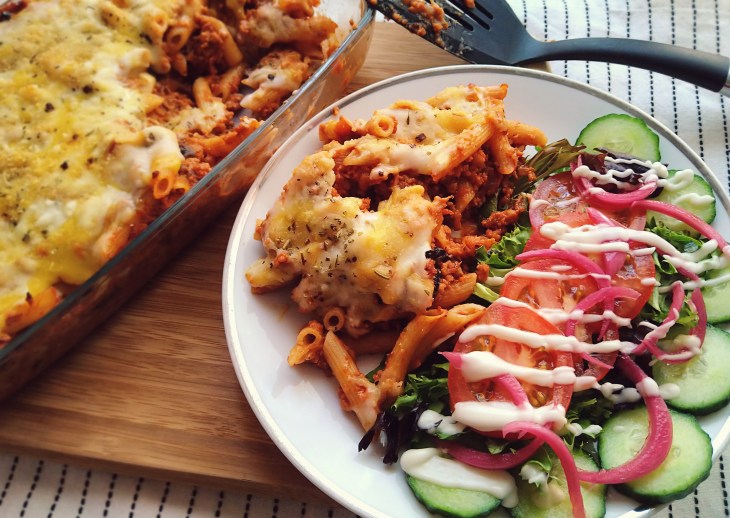 This hearty baked pasta dish is easy to make, packed full of plant based protein, and would be great to serve for a family dinner. It’s topped with a deliciously melty layer of dairy free cheese, Italian herbs and toasted breadcrumbs. I served this with a simple green side salad, but it would be great with some crusty garlic bread too. I’ve also included some ways I like to cook with dairy free cheese, and some tips on melting cheese, so skip to the bottom for those