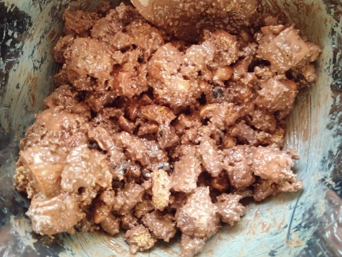 - Once the chocolate has melted, pour it into the mixing bowl. Give everything a good mix and ensure everything is covered in the chocolate
