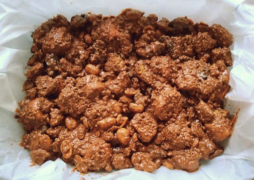 - Line a dish with baking paper and spoon the mixture into it, pushing it down with the back of a spoon