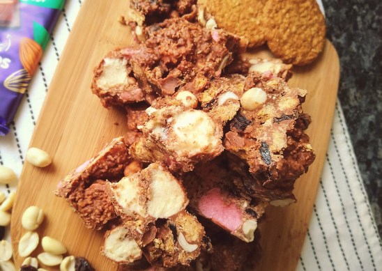 These rocky road bites contain marshmallows, oat biscuits, peanuts and raisins wrapped in dairy free milk chocolate. They’re easy to make, and easy to customise to suit your tastes. They’re ideal for an afternoon snack, added into a packed lunch, or for a picnic