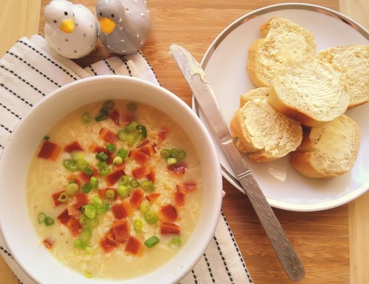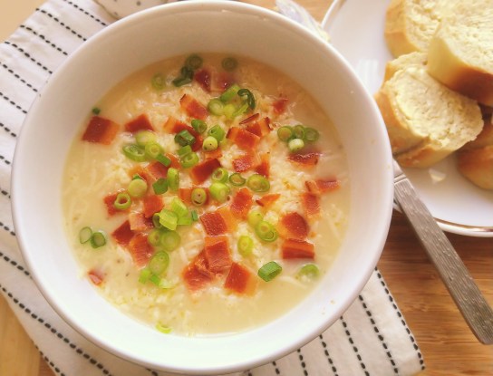 - Now the soup is ready to serve, I topped mine with additional grated cheese, some crispy fried vegan bacon, and spring onions