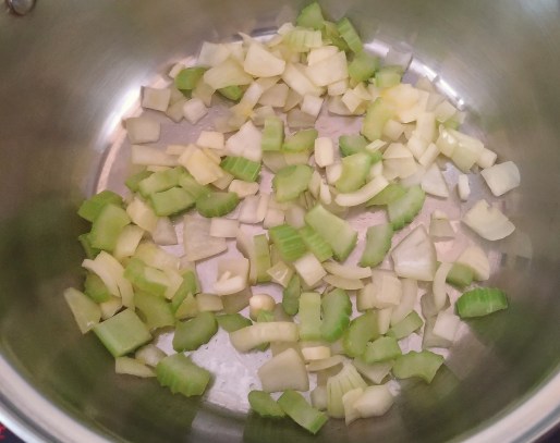 - Start by heating the oil in a large saucepan over a medium heat. Once it’s warmed up, add in the onion and celery. Give them five minutes to start to soften