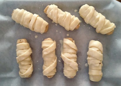 - Allow the pastry to come to room temperature before unrolling it. Use a sharp knife and slice the pastry into thin strips. Carefully wrap three or so strips around each sausage, covering it, keep going until all the sausages are covered. Place the sausages onto a lined baking tray, and brush each one with a little plant milk