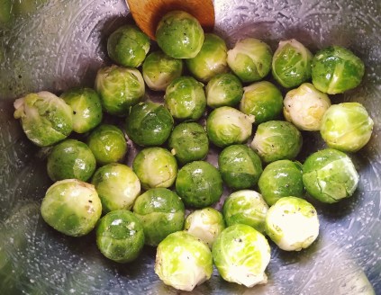 - Wash the sprouts, peel and discard the outer leaves and trim the stems. Dry them off, then add them into a mixing bowl with the oil, salt and black pepper. Toss the sprouts until they’re evenly coated
