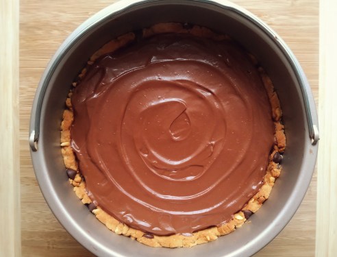 A rich, dark chocolate and silken tofu cheesecake, with a chocolate chip cookie crust. All you need for the crust is flour, peanut butter, chocolate chips and syrup. The no bake filling is simply melted chocolate, silken tofu and icing sugar blended together to make a creamy indulgent dessert