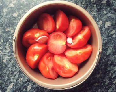 - Start by slicing the tomatoes in half, or quarters if they’re very large. Pop them into a dish along with the whole garlic cloves, with the skins on, finally sprinkle over a pinch of salt