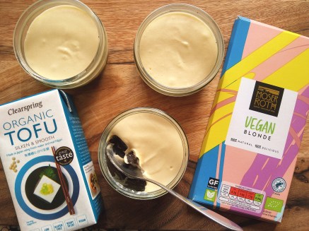 Creamy dairy free white chocolate cheesecake, with a cookies and cream biscuit base. These individual cheesecakes are easy to make, they only require five ingredients, and you can make them ahead of time. The biscuit base is simply biscuit and dairy free butter, and the filling is melted white chocolate, silken tofu and a little icing sugar. It’s also a good way to reuse Gü glass ramekins, I always seem to have quite a few of those kicking around