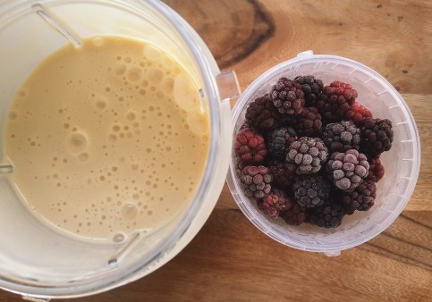 A fruity, creamy, ice cold milkshake that’s a good source of protein, and a tasty way to cool off in the heat. Freezing the blackberries chills this milkshake down without needing to add any ice. It also means that you don’t need a high speed blender to make it. I’ve been enjoying picking blackberries lately, and this is a fun way to use them up