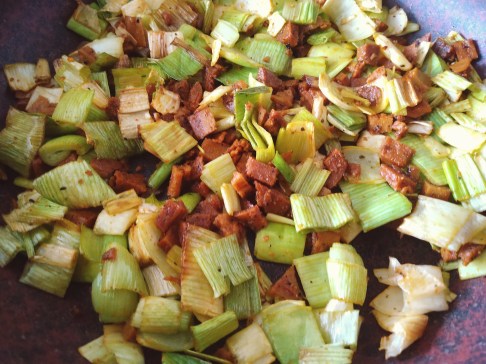 - Then add in the roasted leeks, and stir it through the lardons and butter until everything is well combined.