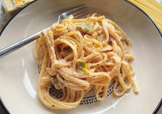 Linguine stirred through sweet roasted leeks and smokey meat free bacon lardons in a rich dairy free sauce. This recipe is easy to make and comes together in just 30 minutes. I realise that mock meats aren’t for everyone, so if you’re not a fan, try replacing them with the same amount of diced smoked tofu, or diced white mushrooms. Silken tofu provides a wonderful creamy base for this sauce, it’s then flavoured with garlic, onion, dijon mustard, herbs and nutritional yeast to give it a sumptuous savoury flavour. As this calls for silken tofu, you won’t need a high speed blender to get a beautifully smooth sauce
