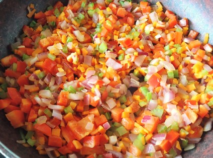 - Next add in the red pepper and garlic, give them a good mix through and give them five minutes to cook with the rest of the vegetables, stirring occasionally