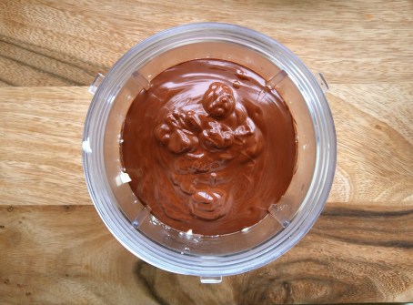 - Next, melt the chocolate using either a microwave or a double boiler, being careful not to overheat the chocolate. Once all of the chocolate has melted, add it into the blender/food processor