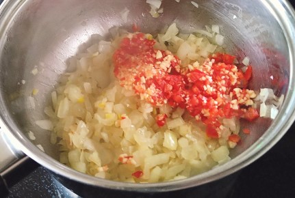 - Next, stir the garlic and the chilli through the onion, and give them four or five minutes to cook