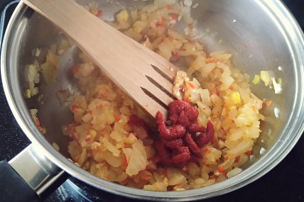 - Now add the tomato puree into the saucepan, and give it a good mix through to combine. Give the tomato puree two or three minutes to cook