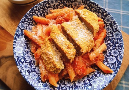 A meaty seitan chicken fillet, with a crispy, crunchy seasoned breadcrumb coating. Along with penne, in a chilli and garlic tomato sauce. Top with your favourite dairy-free parmesan style cheese for a hearty, filling meal. Seitan is a brilliant mock meat, and source of plant based protein. I’ve mentioned previously how much I love seitan, it works really well in this dish but as already established I am horribly biased in its favour. This seitan is simple and easy to make, so if you’ve not tried making seitan before, don’t be put off. It’s easier to make than you might think