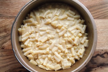 - Boil the macaroni as per the instructions on the packet, knock a minute or so off the cook time as it will continue to cook while it bakes. Once boiled, drain away the pasta water and return the pasta to the saucepan. Set aside 150g of the sauce, then pour the remaining sauce over the macaroni and give it a good stir