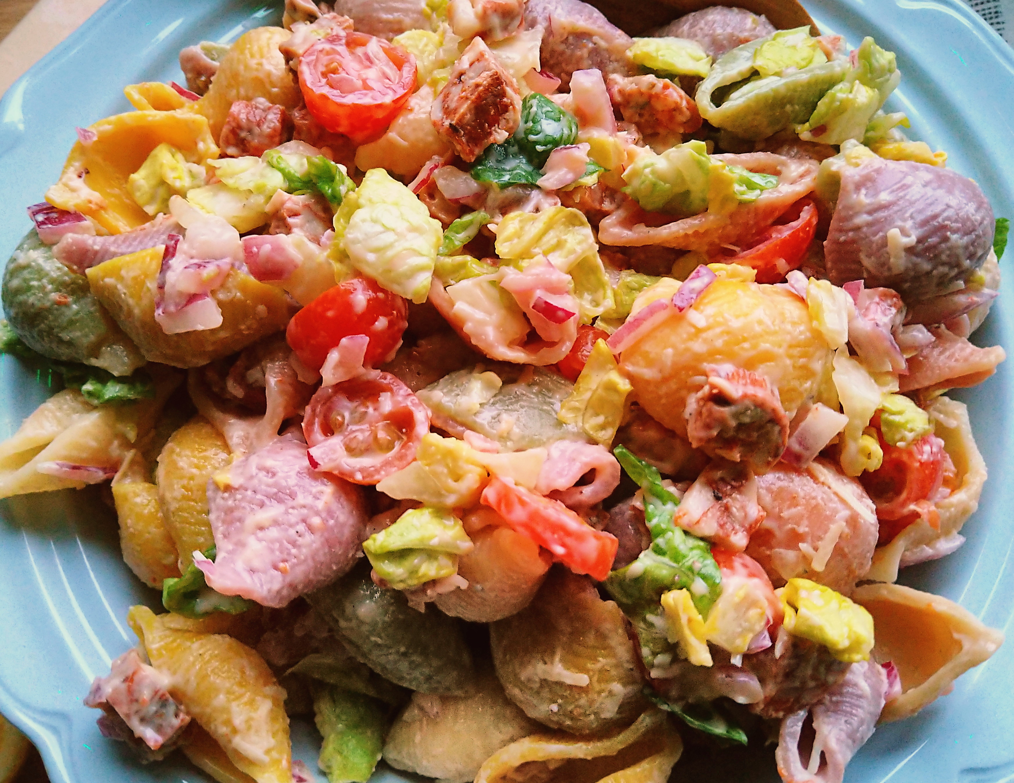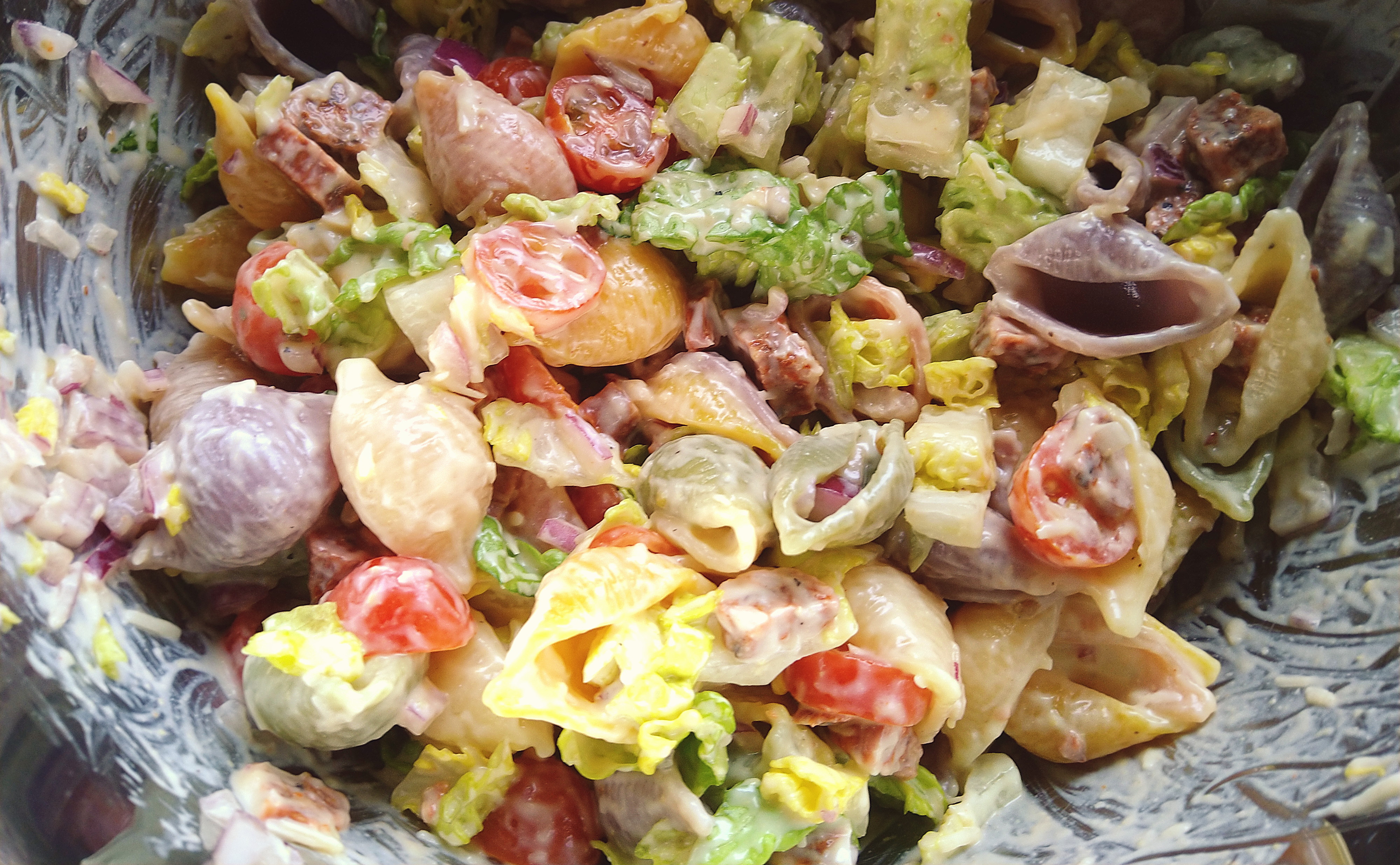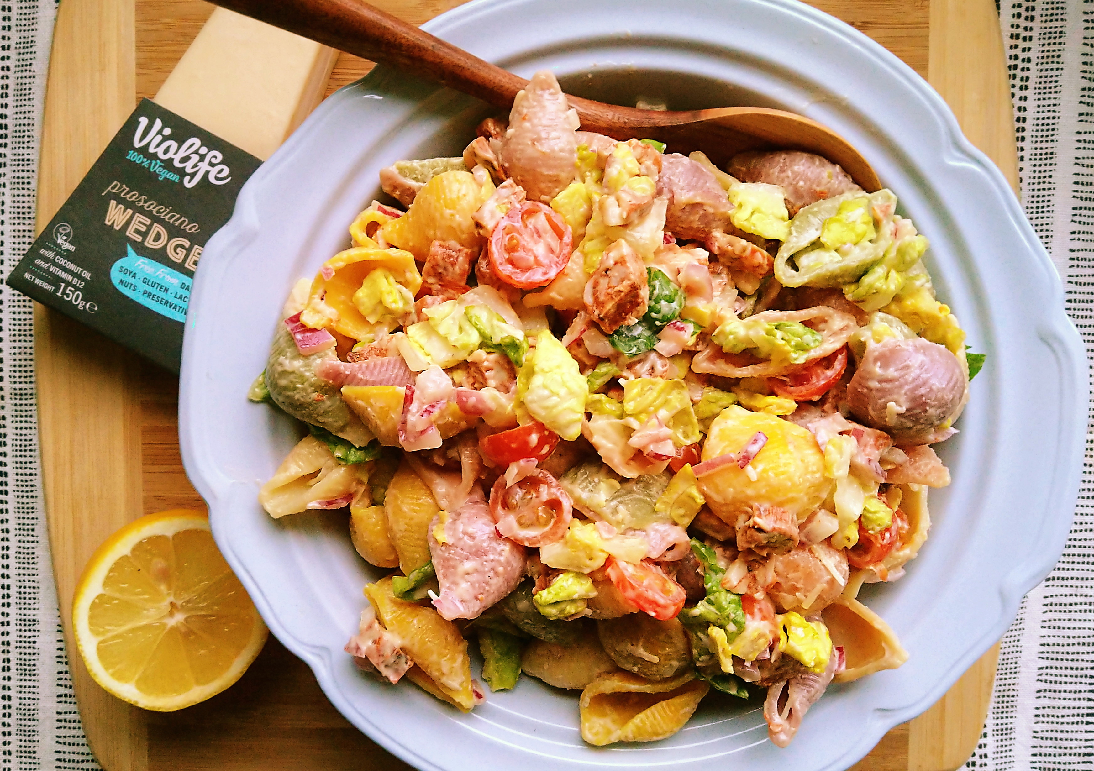 This bright, colourful pasta salad is based on one I made last year. I wanted to remake it, and note down everything that I used, so that I can make it again in future. It combines five colour conchiglie (shell pasta), salad vegetables and meat-free chorizo, in a creamy dairy-free parmesan dressing. Of course, pretty much any pasta will work for this, but I like how pretty the mix of colours is