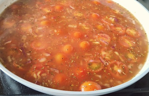 - Then add the cherry tomatoes, tomato puree and hot vegetable stock into the frying pan, give everything a good stir to combine