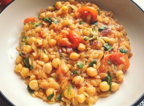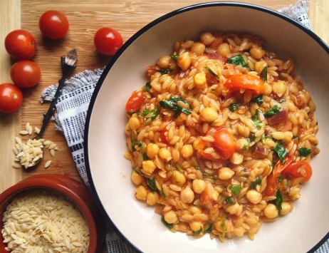 This dish combines orzo, chickpeas and vegetables, in a flavourful tomato sauce. It’s hearty and filling, and only takes 20 minutes to cook, so it would be ideal for a quick midweek meal