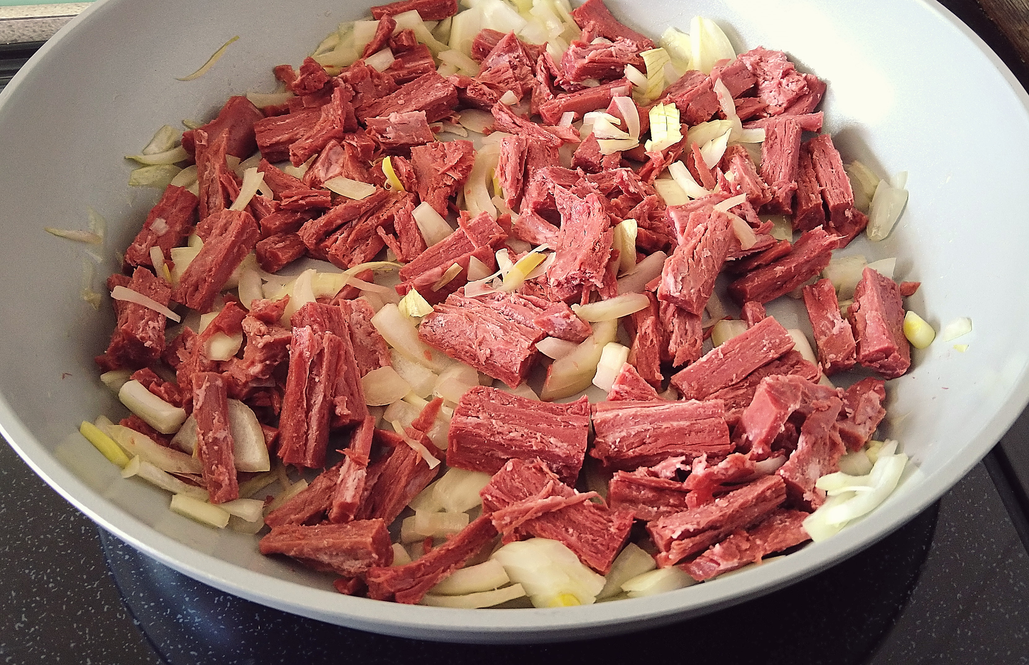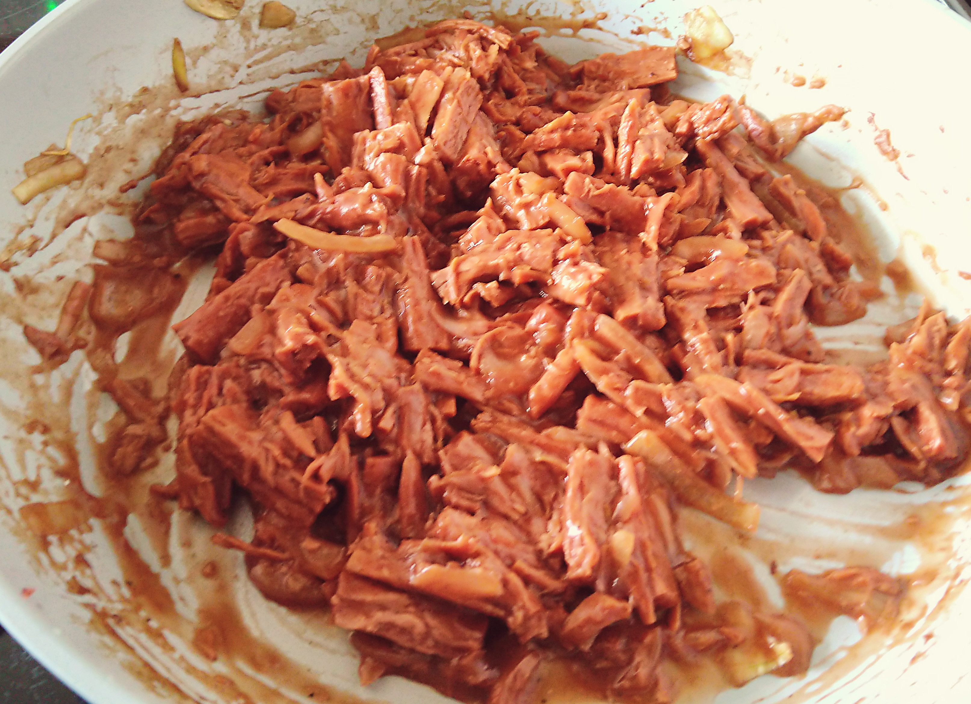 • Next, add the shredded plant-based steak to the frying pan and cook for another ten minutes, stirring every now and then