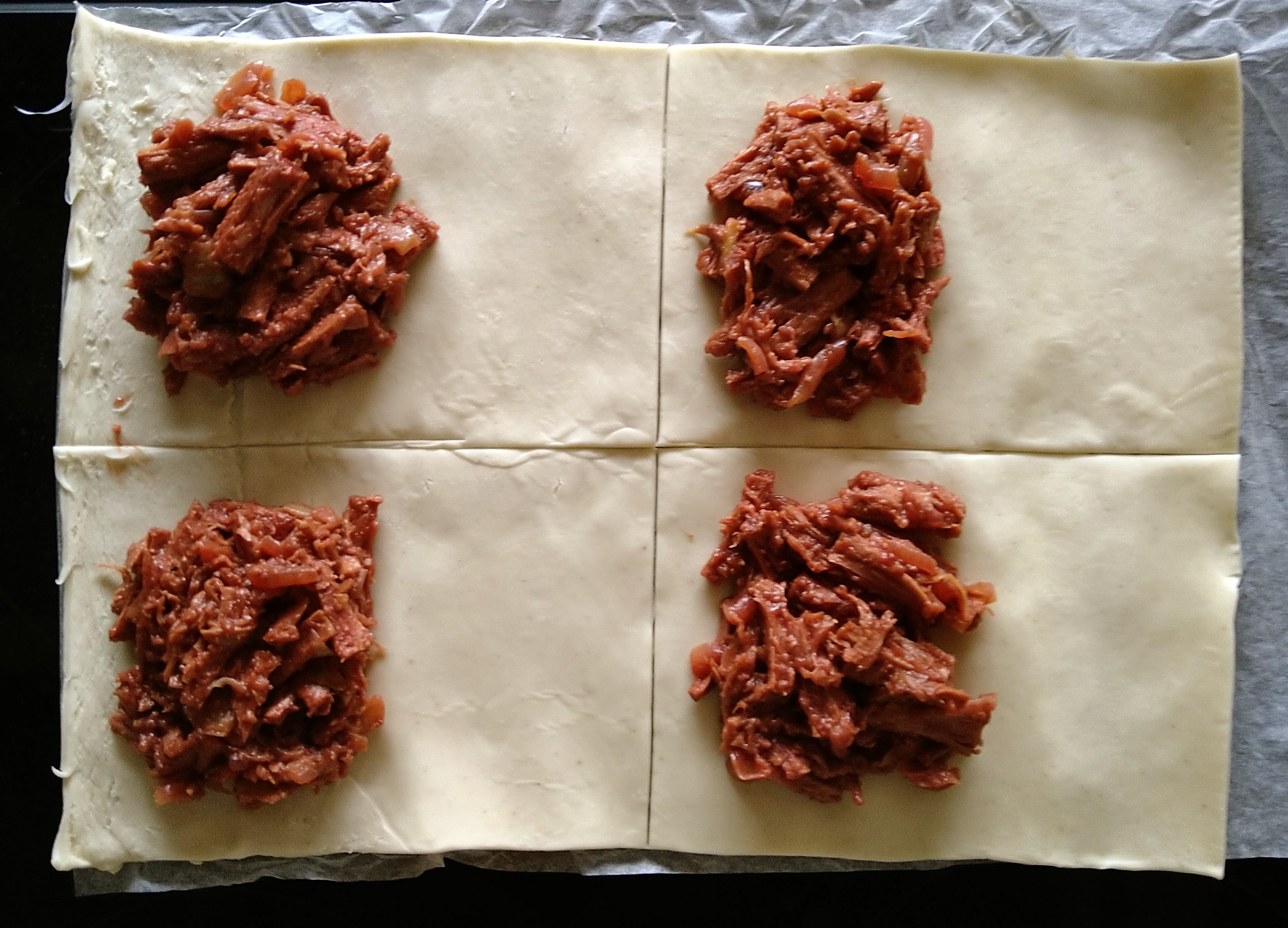 • Split the pastry evenly into four equal pieces, and put one quarter of the steak mixture onto each piece