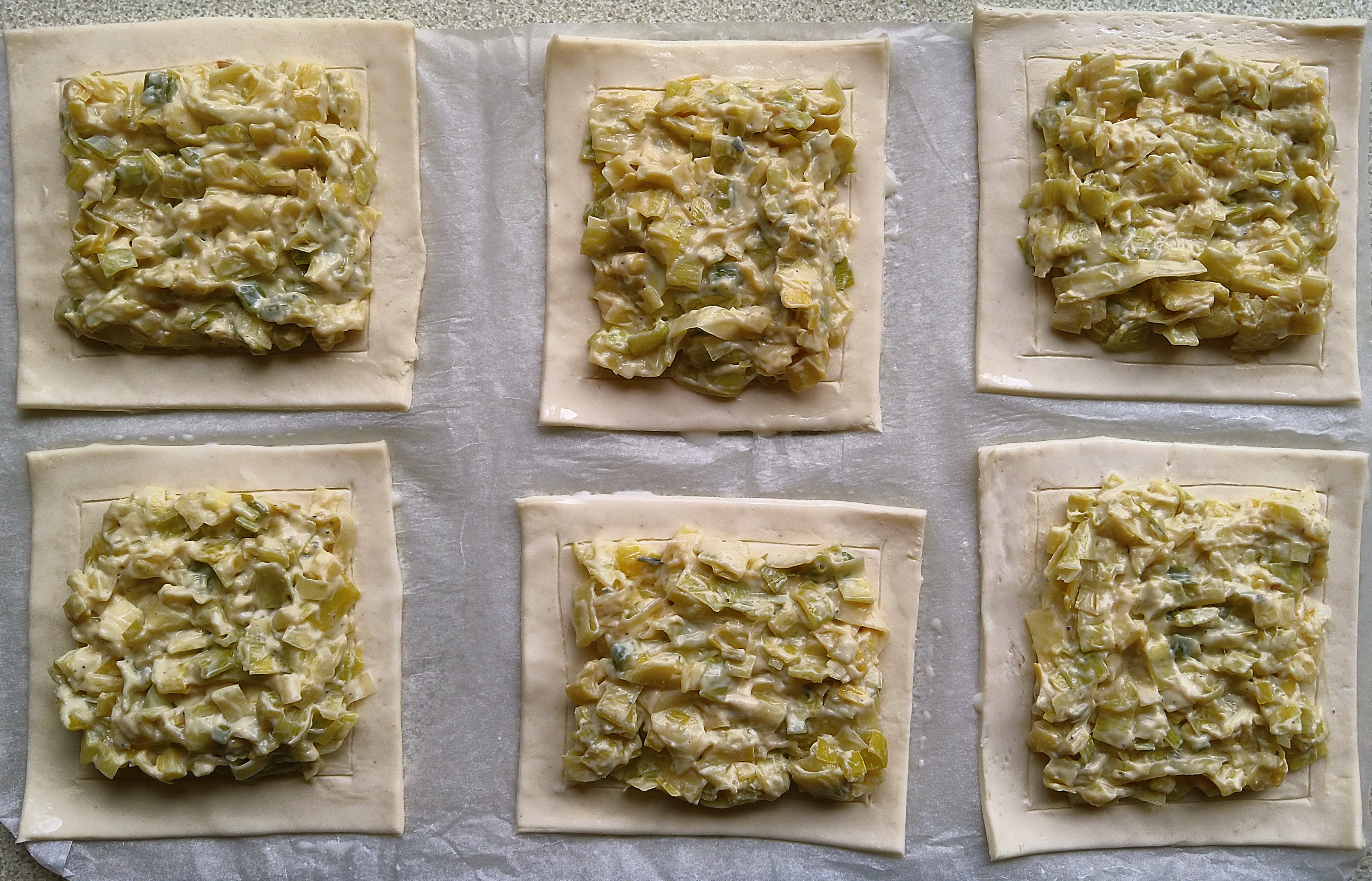 - Place one-sixth of the creamy leek mixture in an even layer onto each piece of pastry. Brush the edges of each piece of pastry with dairy-free milk