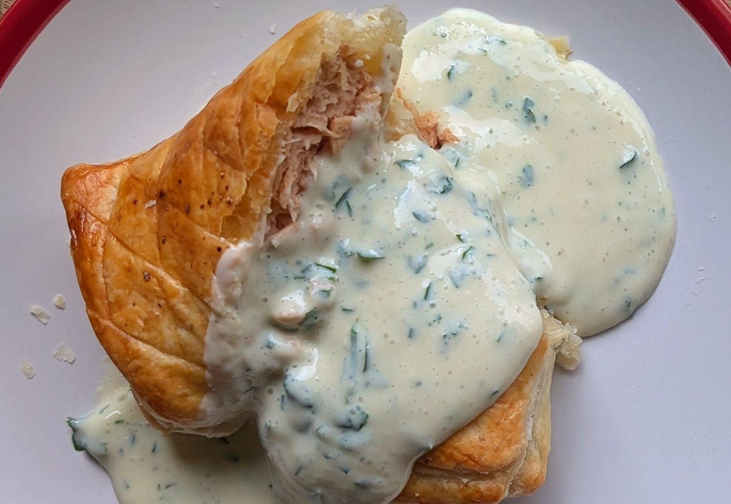- Place a tablespoon of the parsley sauce in the middle of the pastry, top with the salmon fillet, then another tablespoon of sauce. Finally fold the pastry over the fillet and use a little milk to seal the pastry