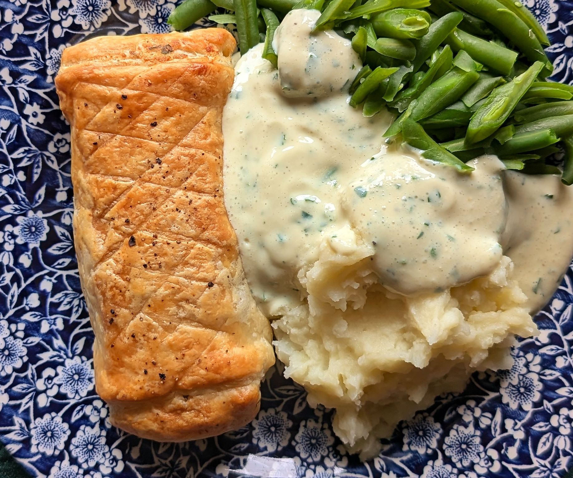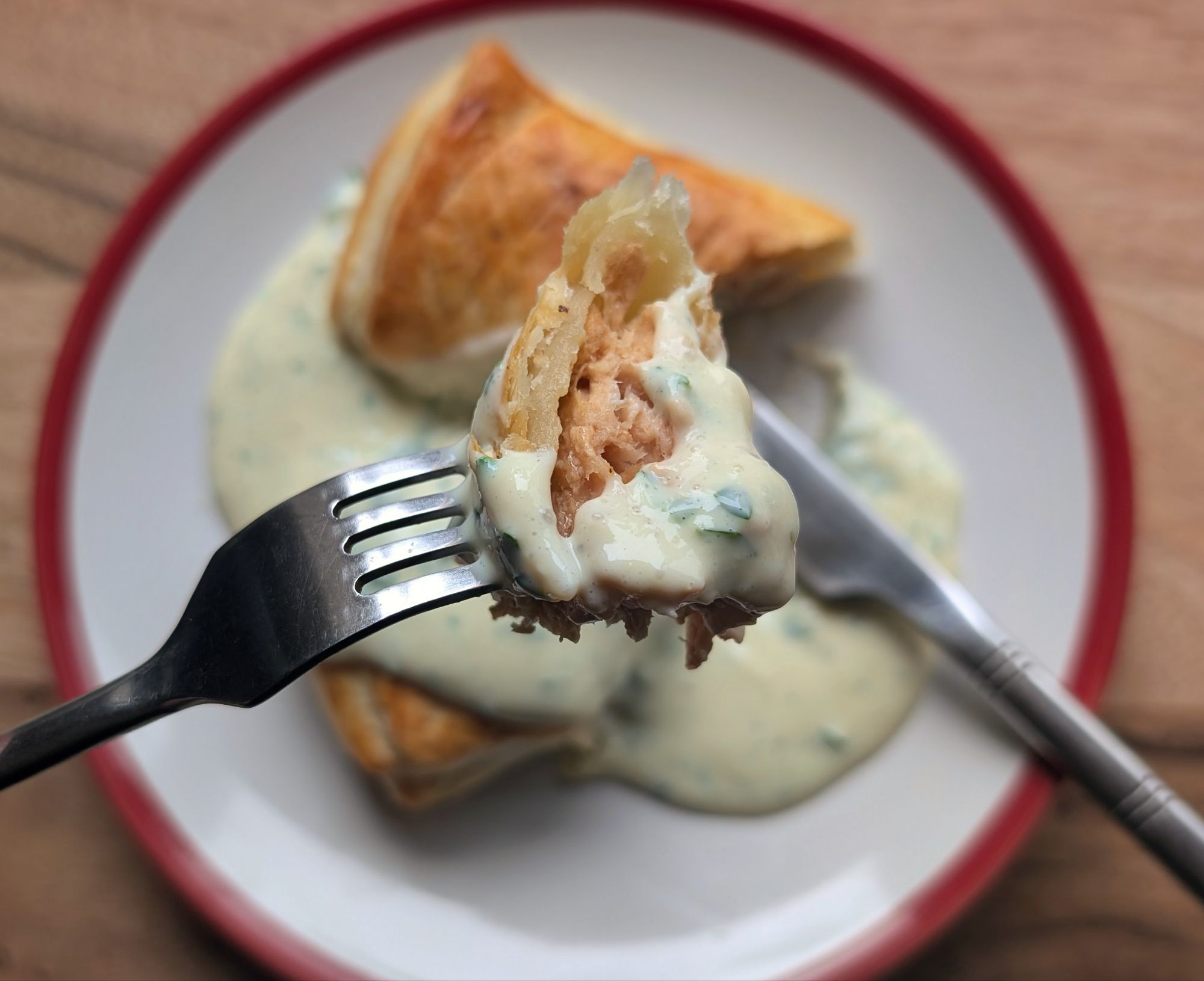Tender, flaky fish-free salmon and parsley sauce, encased in golden brown puff pastry. This would be ideal served as a festive main dish, along with potatoes, vegetables, and more parsley sauce. I used plant-based salmon by Vivera, I personally love these fish-free fillets and they worked perfectly for this dish. However, if these aren’t available where you are, then I would replace these with meat-free chicken fillets instead