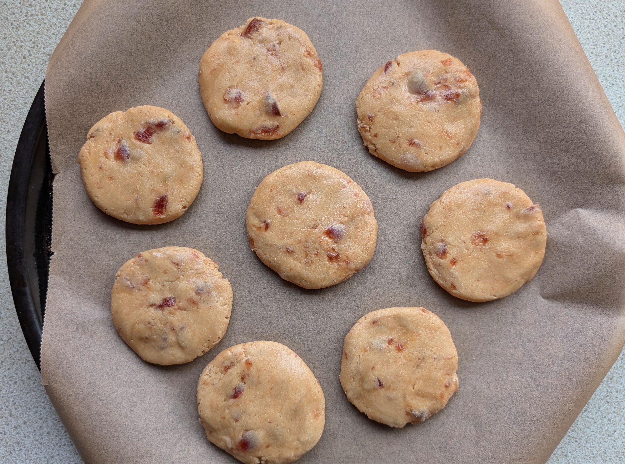 - By this point it should form a dough. Split the dough equally into eight pieces, roll each piece into a ball, then squash it flat between your palms. The cookies won’t spread as they bake, so you will have to shape them appropriately beforehand