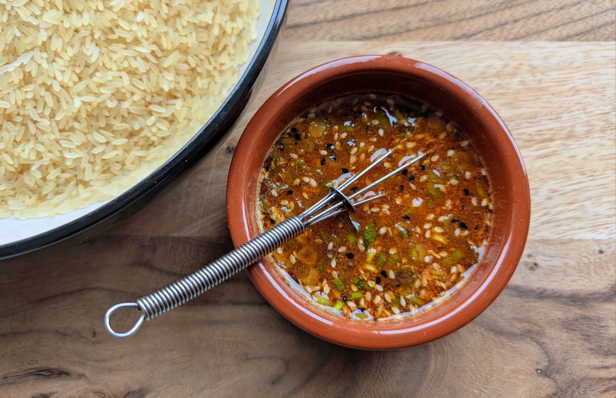 - Cook the rice as per the instructions on the packet, the rice I was using cooked in 15 minutes. Then add the oil, soy sauce, smoked paprika, onion granules, garlic granules, white sesame seeds and black sesame seeds together in a small dish and whisk until well combined