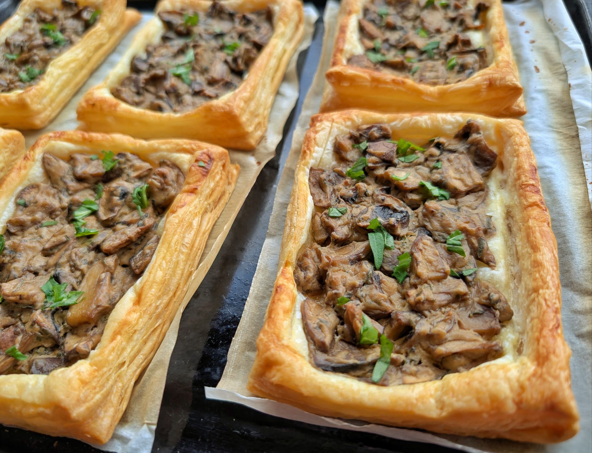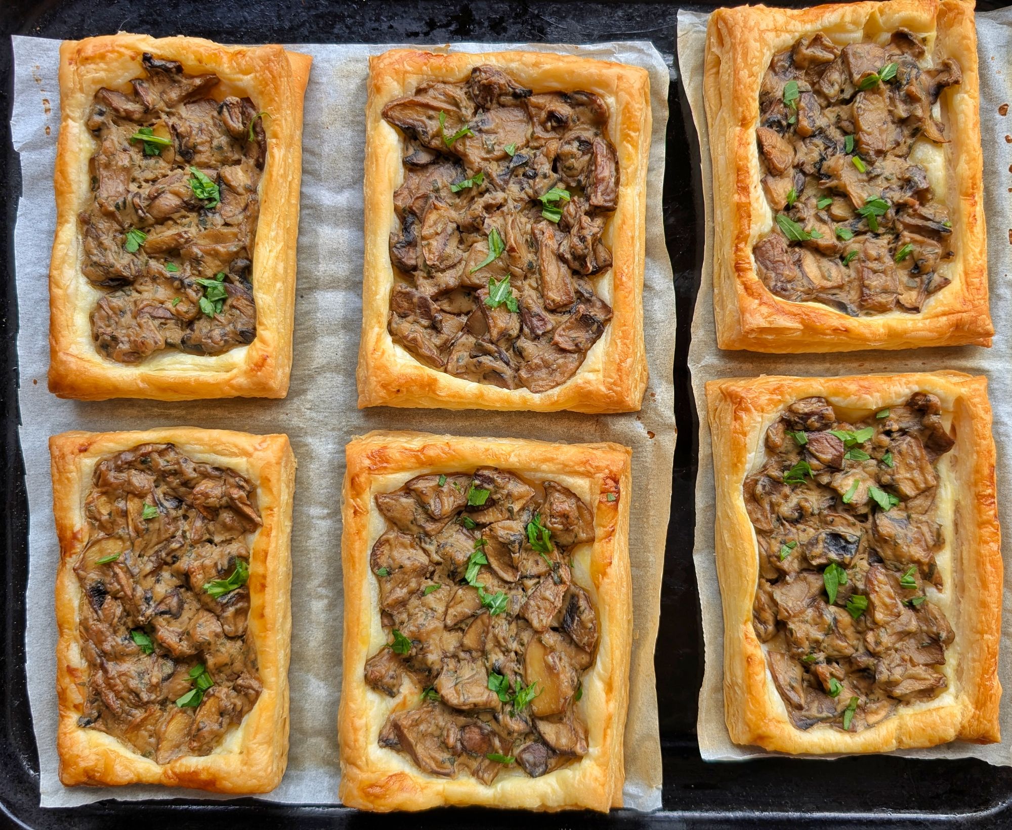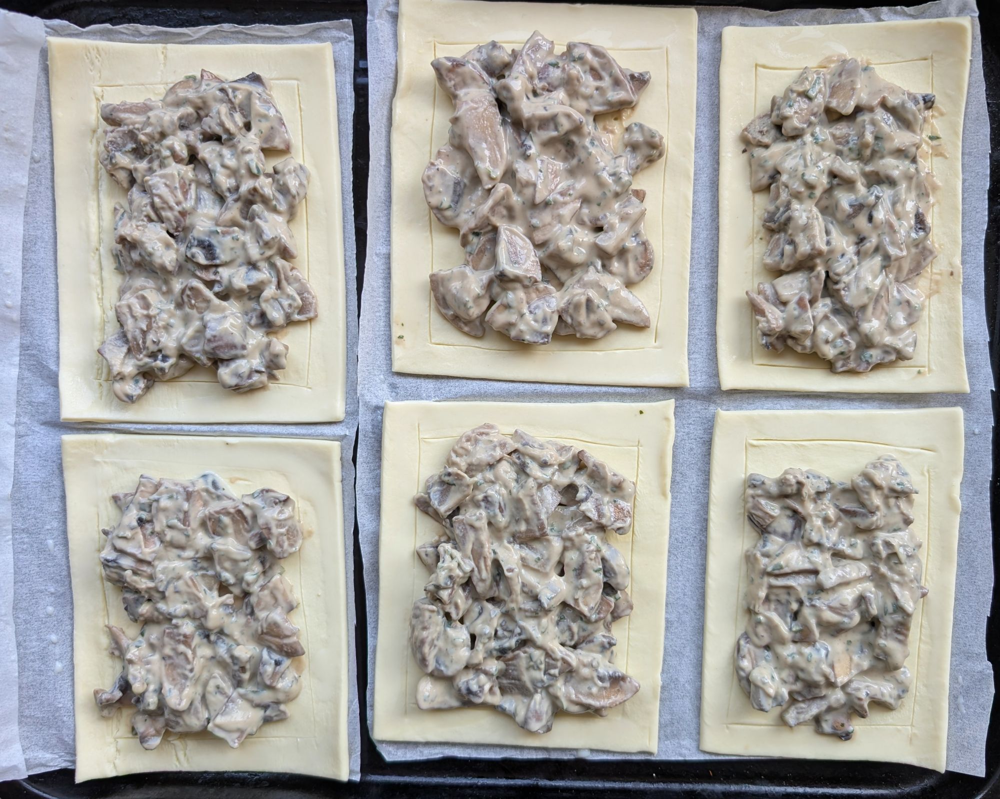 - Equally divide the mushroom mixture onto each piece of pastry and brush the edges of the pastry with the plant-based milk