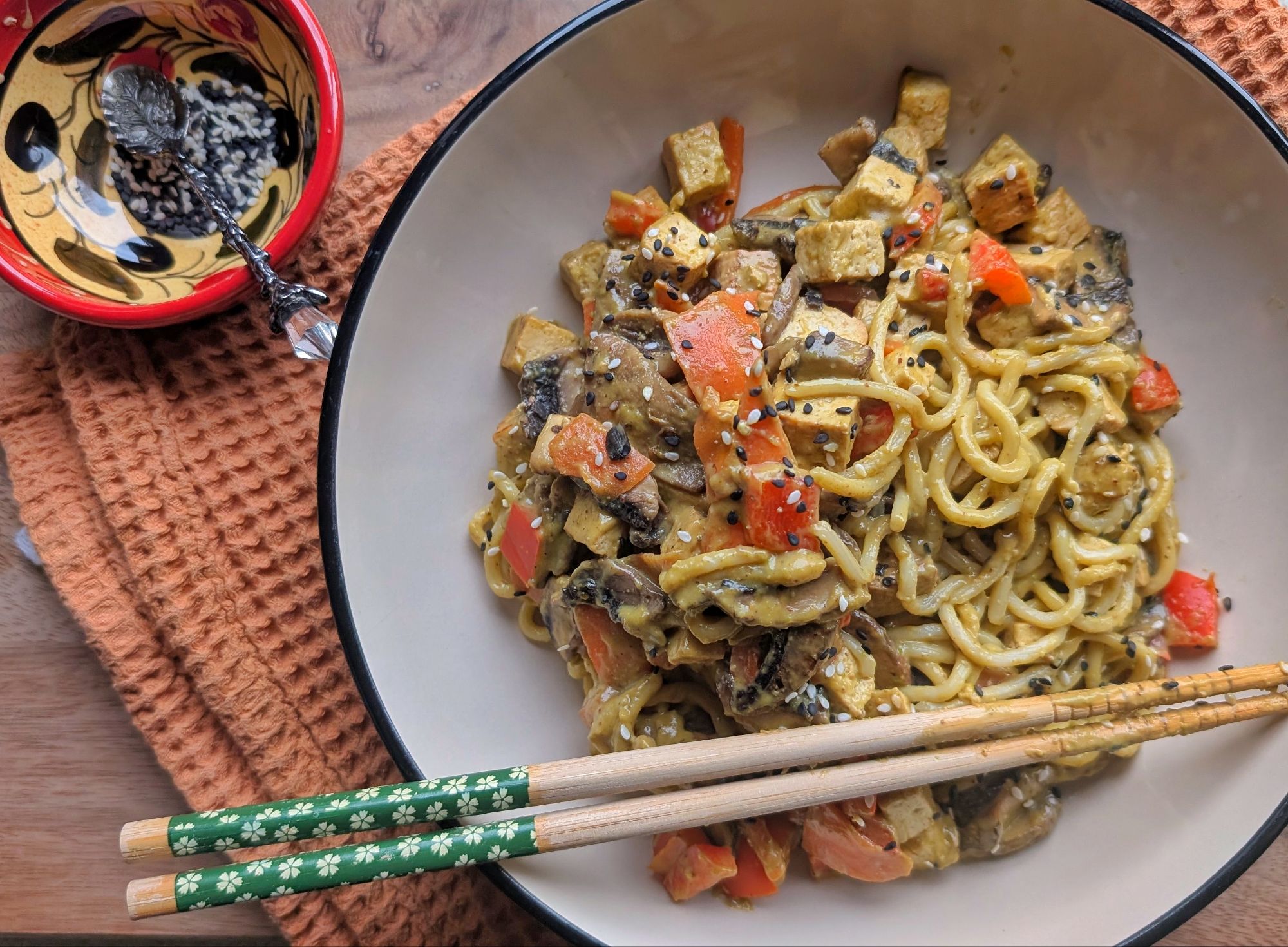 This stir fried noodle dish combines vegetables, diced smoked tofu and wheat noodles, in a deliciously nutty pistachio satay sauce. This twist on a satay sauce makes a delicious stir fry sauce, or dipping sauce. To make this using homemade pistachio butter, you can see how I make that here