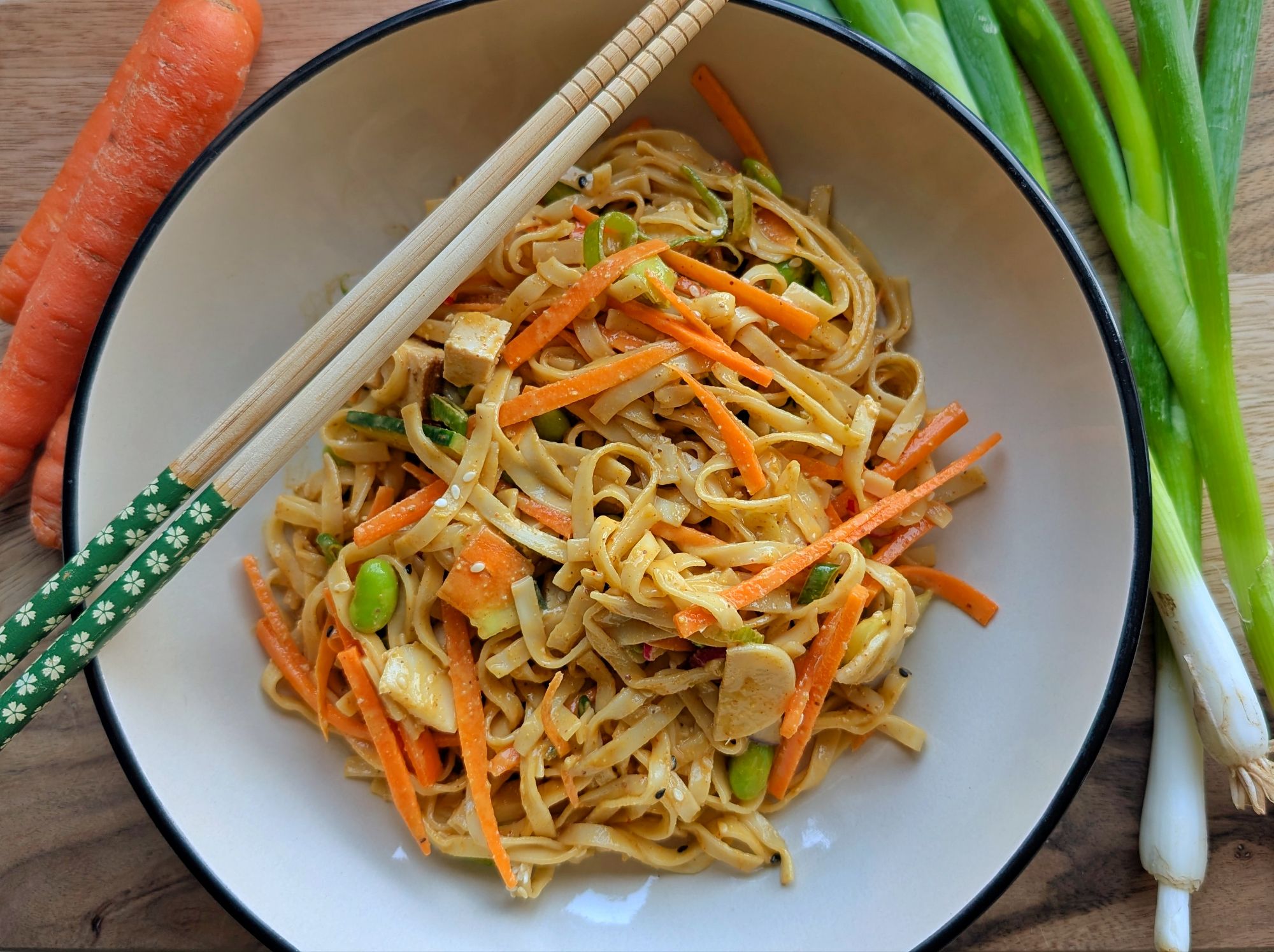 This cold noodle salad combines vegetables, noodles and smoked tofu, in an Asian-inspired sauce. It’s ideal warm weather food and it’s perfect for lunches or main meals. It also keeps well in the fridge for a few days, so it’s great to for lunches in the week. It’s been especially warm here recently, so food like this is very much on my radar at the moment. Eating hot food makes me feel hotter than a dragon’s armpit, so I’m avoiding it if I can