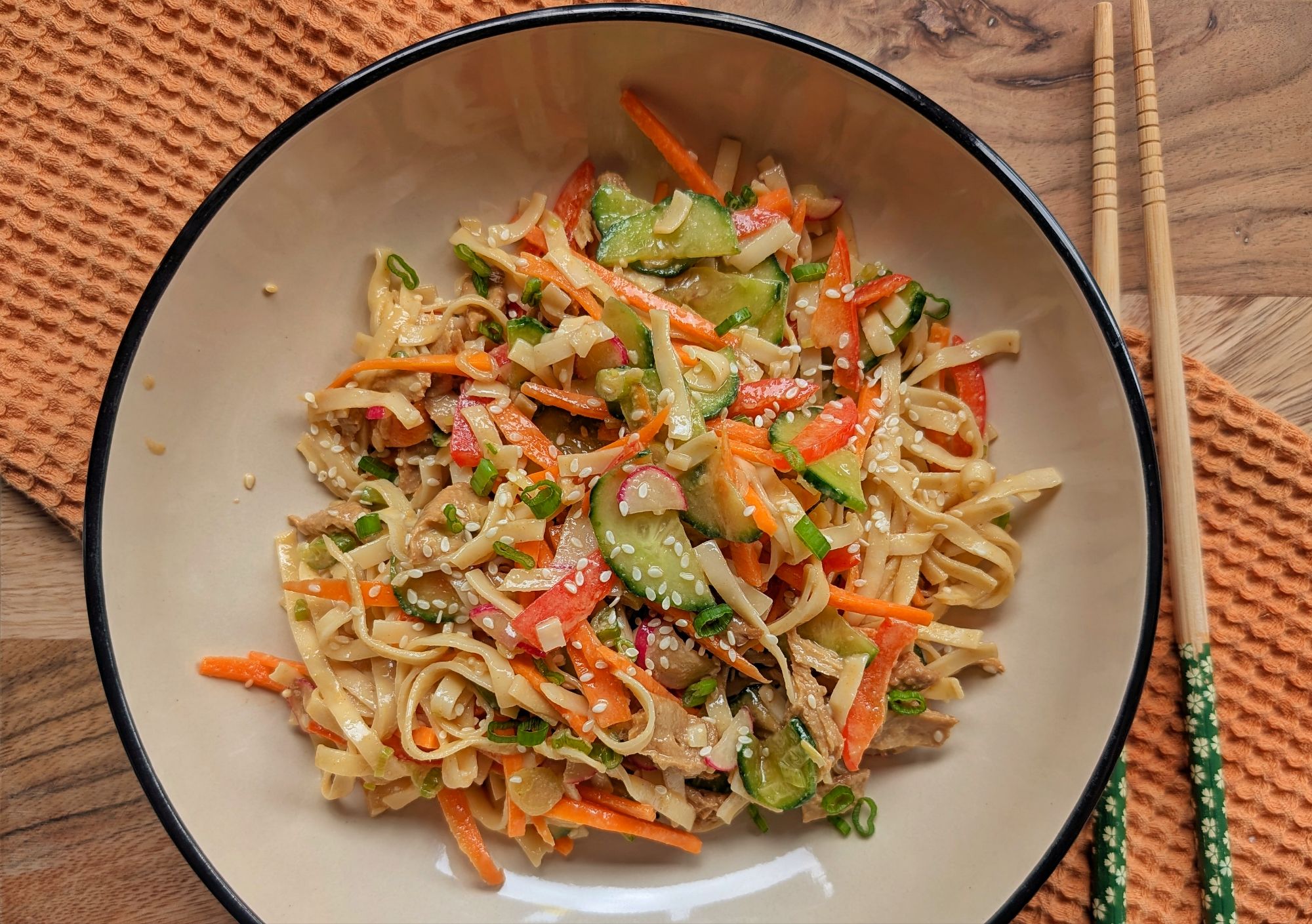 This delicious cold noodle salad is ideal for when the weather warms up, and you don’t fancy eating hot food. It’s also great for packed lunches, or picnics too. It combines crunchy vegetables, shredded mock chicken and noodles, in a savoury sesame sauce. If you’re not a big fan of mock meats (and I get it, they aren’t for everyone) replace it with the same amount of shredded smoked tofu instead