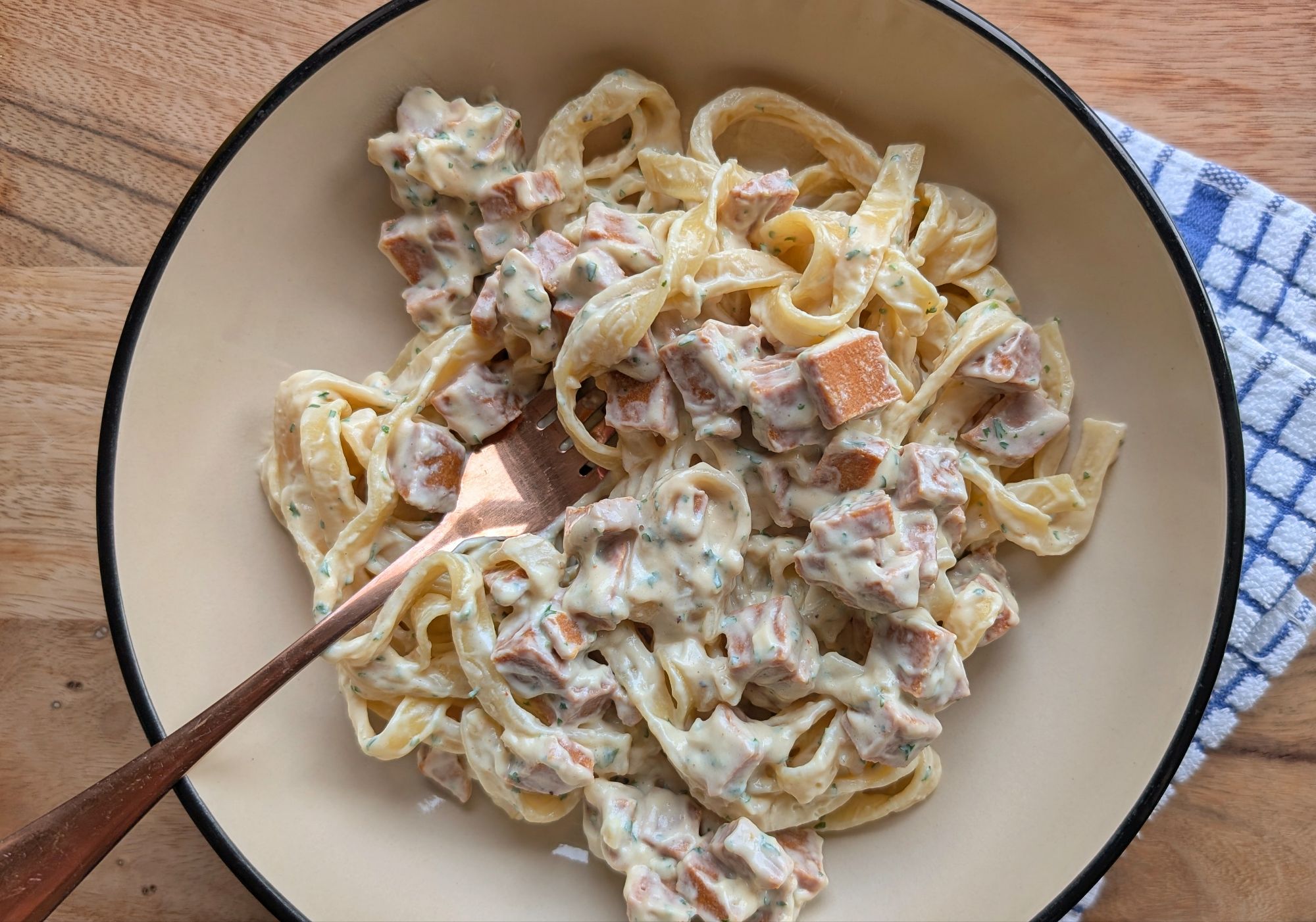It also works beautifully in a carbonara, with spaghetti in a creamy, savoury sauce